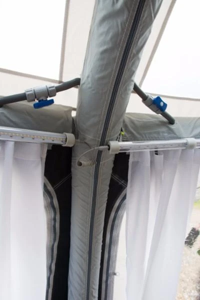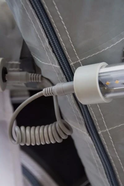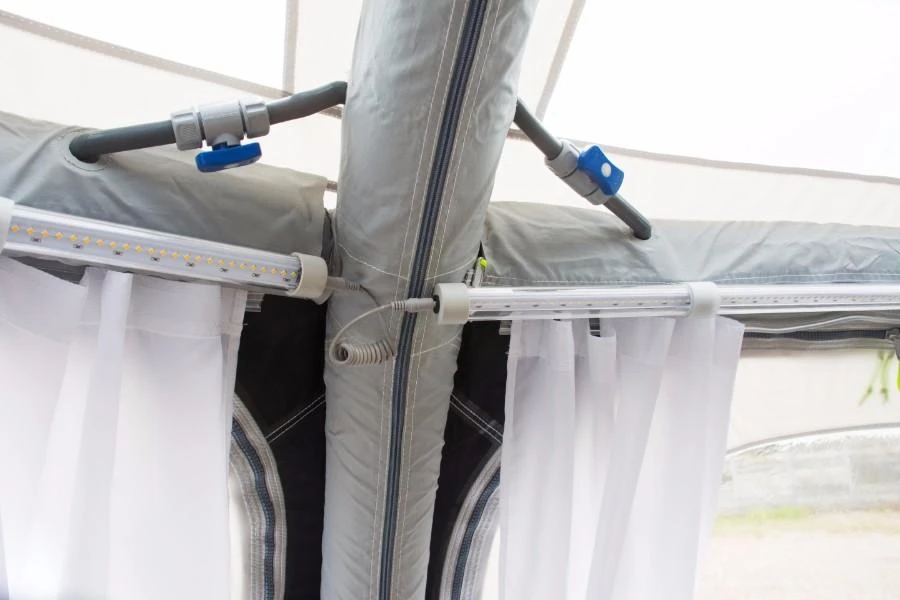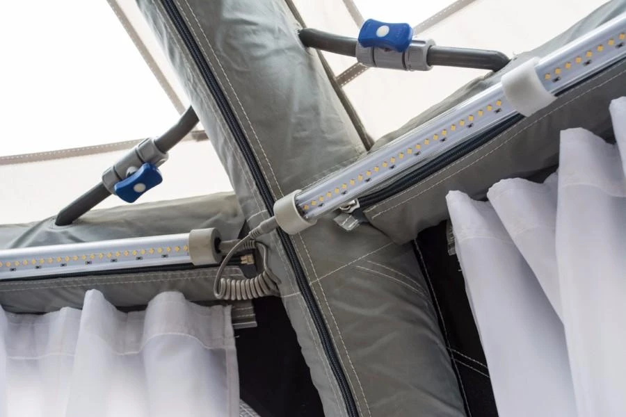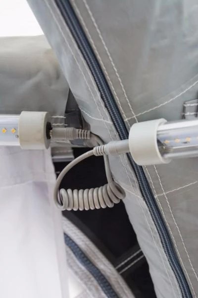 An exciting new accessory for your tent, the SabreLink™ lighting system ensures you’re never in the dark. The system allows you to link up to three lights together – that’s 450 LED’s. Each of our AiFrame awnings is SabreLink™ ready and can accept lights on the front AirPoles and also the centre poles. An Ace AIR Pro 400, for example, could have three lights along the front and another three in the centre.