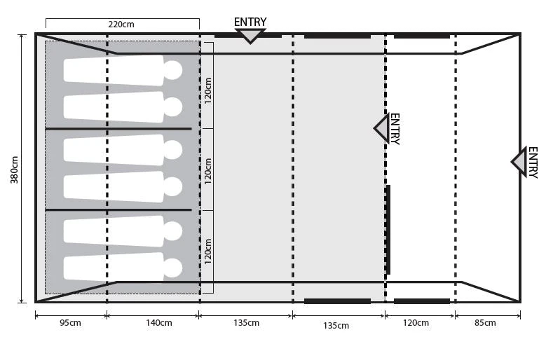 The internal design offers the perfect allocation of usable space for medium to large families. Starting with fully enclosed front porch, this provides an ideal area for relaxation, cooking, or dining whilst granting full protection against the elements. We then head into a generous commune area with the option to add a 2-berth inner tent for extra guests. Finally enjoying the darkened โTwilightโ fabric Six-person bedroom that can be split down to a 2-2-2 configuration using the toggle in dividers. The bedroom ventilation system, and ample mesh ventilation fly screen panels combined with crystal-clear window panels maintain an airy internal space and maximise airflow in warmer temperatures.