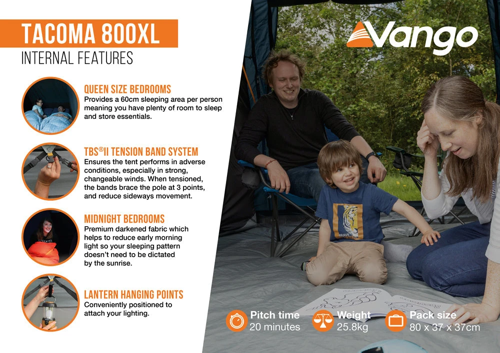 The Vango Tacoma 800XL is a Powerflexยฎ Fibreglass pole 8-man tent with a vis-a-vis layout. Enhanced airflow and ventilation, including airflow vents, have been incorporated into the design. This tent is perfect for campers seeking private sleeping areas, as well as a roomy central living area. The living space is well-lit and airy during the day, thanks to large Diamond Clear windows that can be covered by roll-away toggled curtains at night. The use of Dynamic Weave 100โข Fabric ensures a compact size and light weight, while maintaining Vango’s high standards for quality and durability. For added convenience, an optional side awning can serve as a useful porch for storing extra gear.